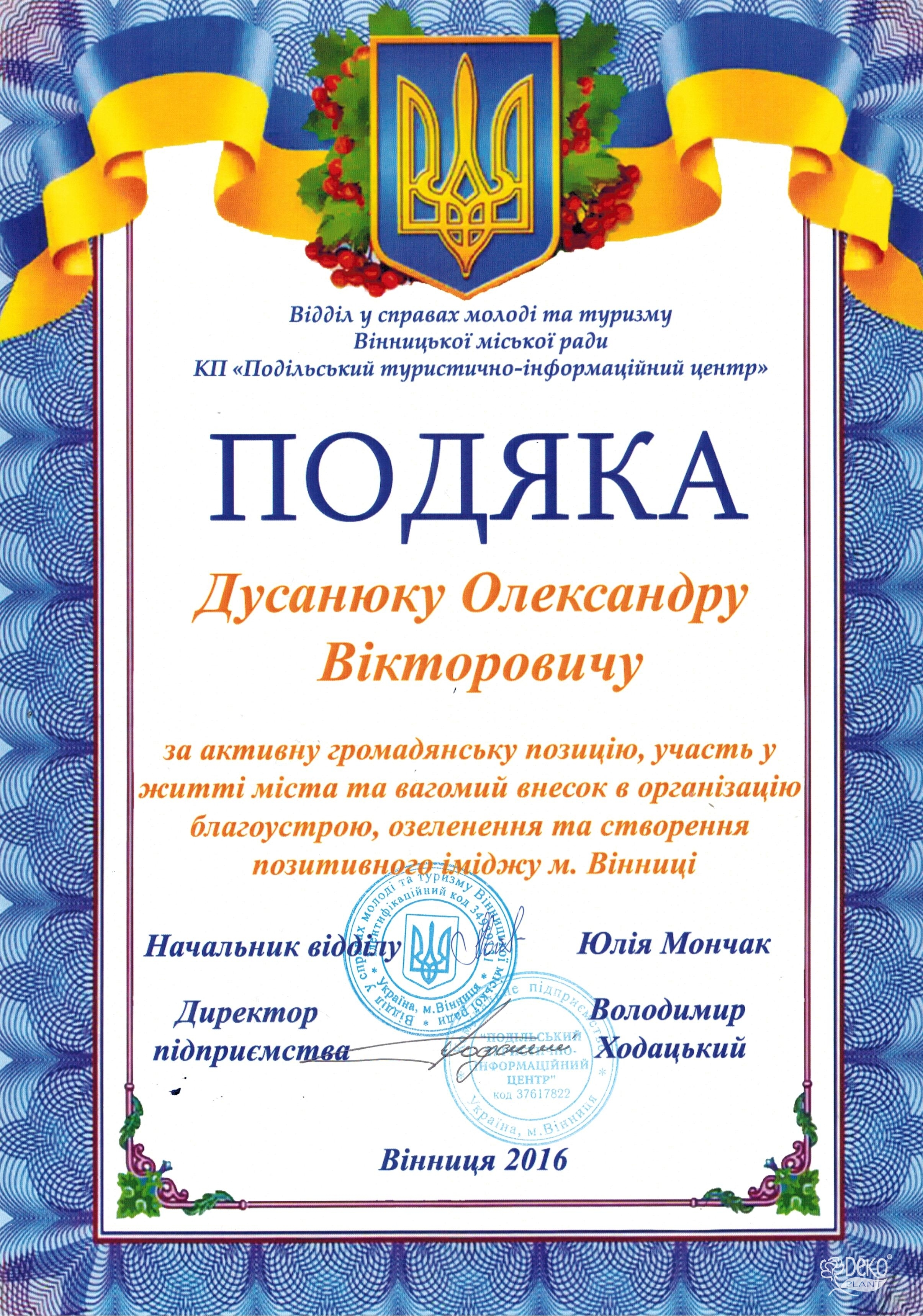 Благодарность за активную гражданскую позицию, участие в жизни города, озеленение и создание положительного имиджа г. Винницы