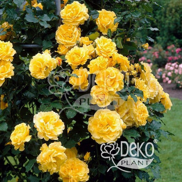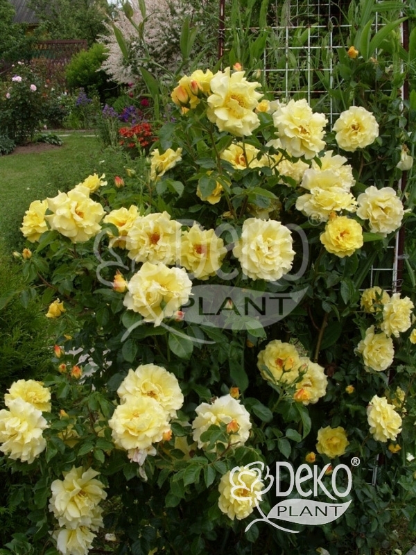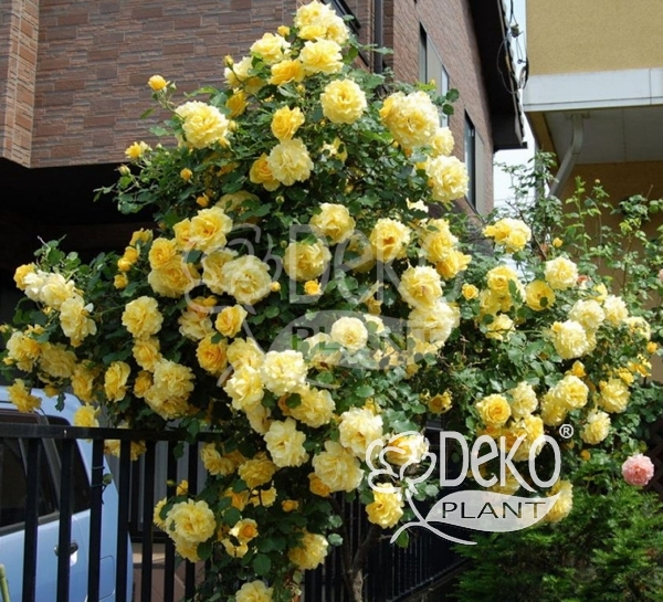 Прекрасная раноцветущая плетистая роза для мягкого климата. Цветки раскрывшись золотисто-желтые, выгорают до лимонных, иногда до кремовых. Они полумахровые, с волнистыми лепестками и красными тычинками в центре – красивое сочетание. Появляются по одному или в небольших кистях на концах длинных побегов, обычно по 3-5 шт. После обильного первого цветения цветки появляются по 1-2 шт все лето, пока не наступит второе обильнее цветение осенью. Хороши в срезке. Побеги толстые, листва блестящая, ярко-зеленая, несколько подвержена черной пятнистости.