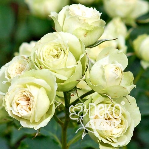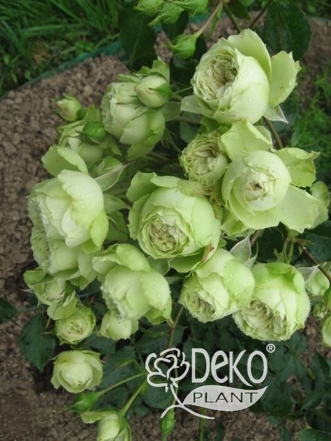 Білі з салатовим відтінком і рум'янцем на крайніх 60-70 пелюстках квітки, кулястої форми, дуже щільно набиті, в невеликих суцвіттях з'являються протягом усього сезону. Аромат легкий.