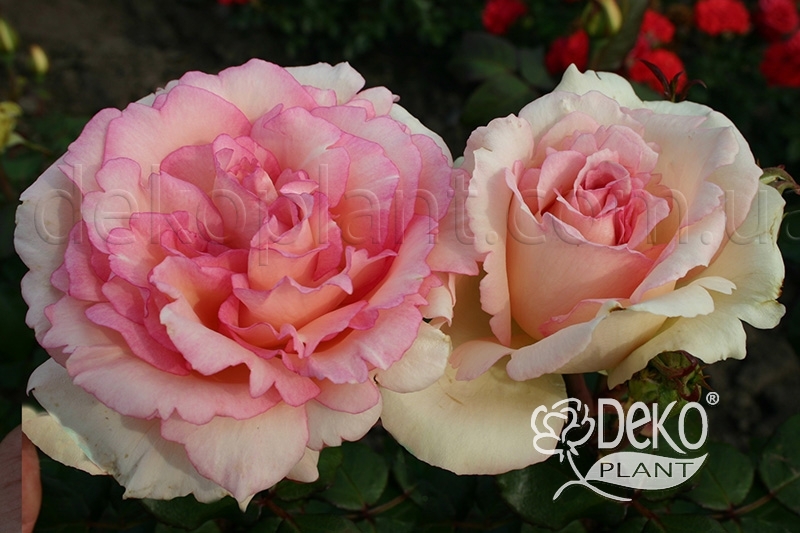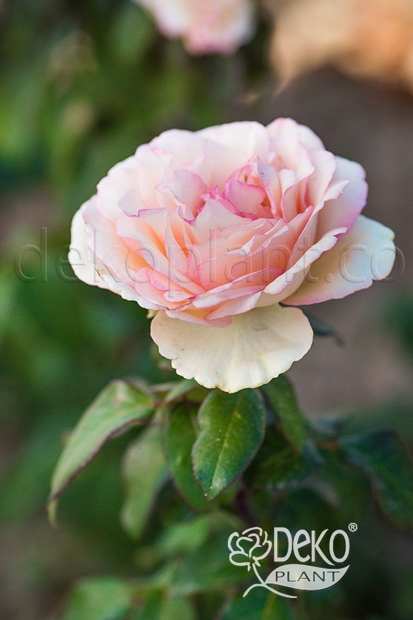 Великі квітки кремово-рожевого кольору з більш світлими крайніми пелюстками і рожевою облямівкою на середніх, з'являються з біло-жовто-рожевих бутонах. У пелюсток красива зубчата облямівка. Кущ вертикальний, листя темно-зелене, глянсове, хороша стійкість до захворювань та дощу.