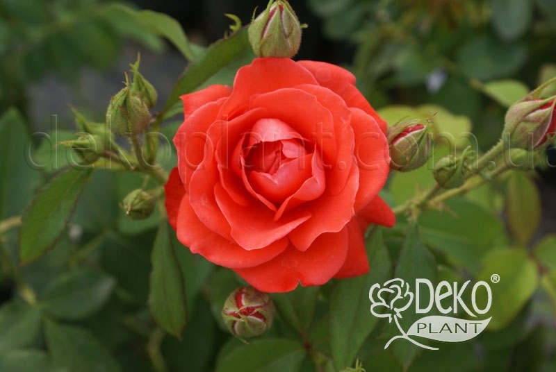 Бутон оранжево-червоний, округло-загострений. Квітки яскраво-помаранчево-червоні з білим вічком, чашовидні або плоскі - 4-7см. Махрові або напівмахрові - 17-26 пелюсток, в суцвіттях до 3-5 штук. Пагони дуже міцні, з середніми численними шипами. Листя світло-зелені, матові. Дуже добре виглядає в групових і одиночних посадках.